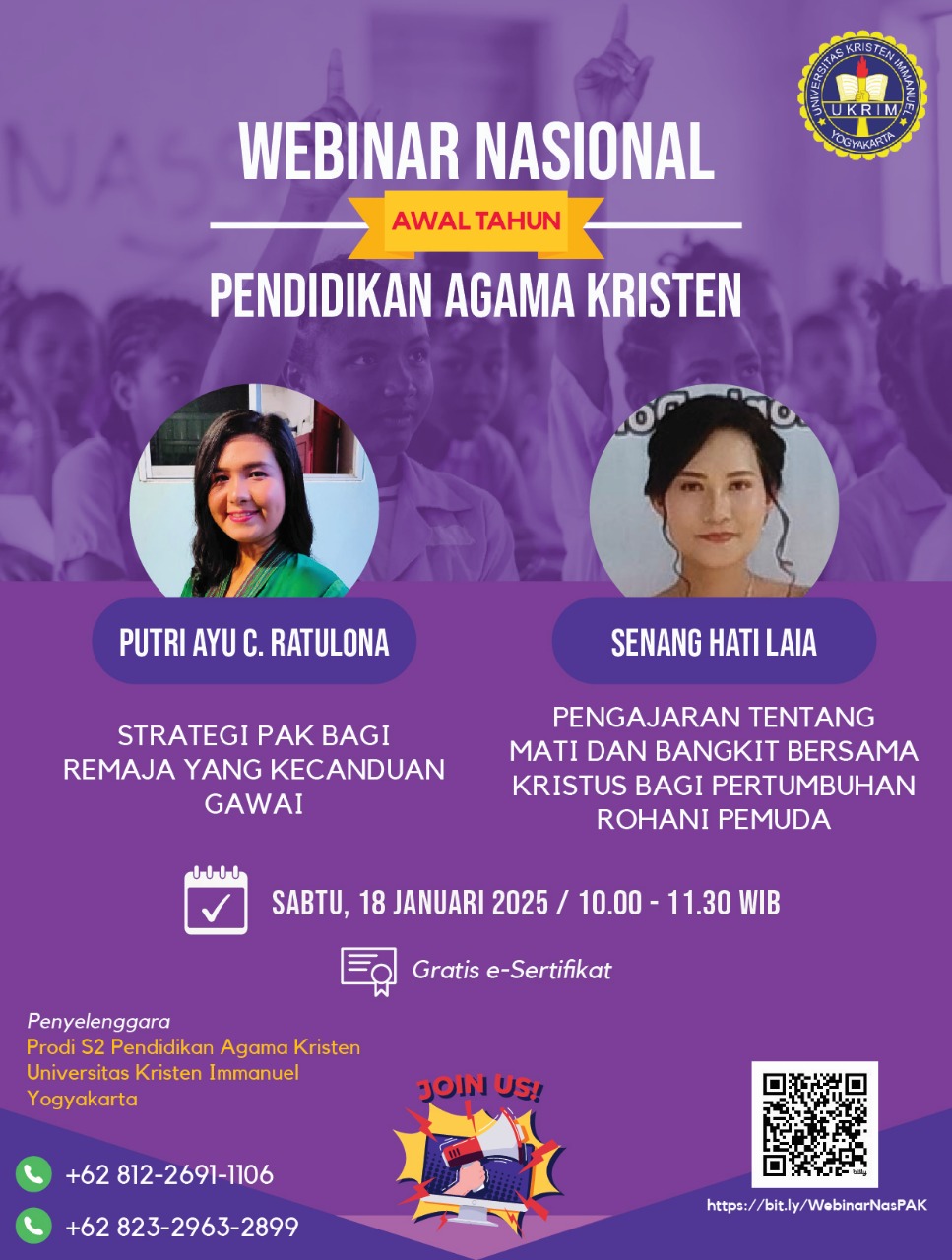 📢 HADIRILAH 📢 WEBINAR NASIONAL PENDIDIKAN AGAMA KRISTEN Universitas Kristen Immanuel (UKRIM) Yogyakarta mengadakan Webinar dengan topik yang penting dan relevan dalam konteks Pendidikan Agama Kristen. Para narasumber adalah Mahasiswa Prodi S2 PAK UKRIM yang akan mempresentasikan tesisnya: 🔖 Putri Ayu C. Ratulona "STRATEGI PAK BAGI REMAJA YANG KECANDUAN GAWAI" 🔖 Senang Hati Laia "PENGAJARAN TENTANG MATI DAN BANGKIT BERSAMA KRISTUS BAGI PERTUMBUHAN ROHANI PEMUDA" PELAKSANAAN 🗓 Sabtu, 18 Januari 2025 🕙 10.00 - 11.30 WIB Via Zoom Pendaftaran (GRATIS): https://bit.ly/WebinarNasPAK (disediakan e-sertifikat bagi yang membutuhkan) Penyelenggara Prodi S2 Pendidikan Agama Kristen Universitas Kristen Immanuel Yogyakarta WA: 081226911106 082329632899